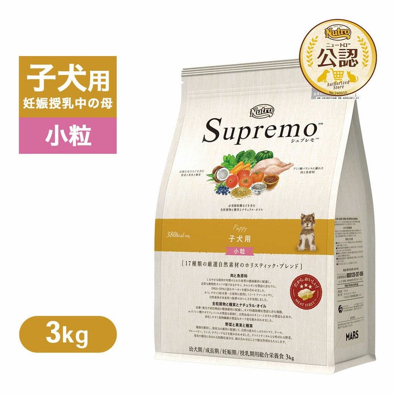 シュプレモ 子犬用は、発育期の子犬の健やかな筋肉や骨の成長、健康な脳の発育、免疫力の健康維持に配慮し、栄養素を豊富に含む高品質な自然素材を厳選し、最適な栄養バランスでブレンドしています。妊娠期/授乳期の母犬、高栄養を必要とする犬にも適しています。【超小型犬~小型犬の子犬に適した、ふやけやすい小粒タイプ】