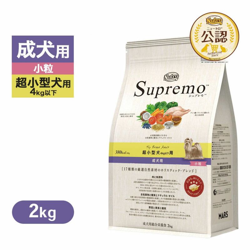 シュプレモ 超小型犬 成犬用は健康で元気な体、美しい皮膚・被毛の健康維持に配慮し、栄養素を豊富に含む高品質な自然素材を厳選し、最適な栄養バランスでブレンドしています。まだ顎・口が小さい、代謝エネルギーが高い、好き嫌いが多くなりがち、などの超小型犬の特徴に配慮しています。【超小型犬に適した小粒タイプ】