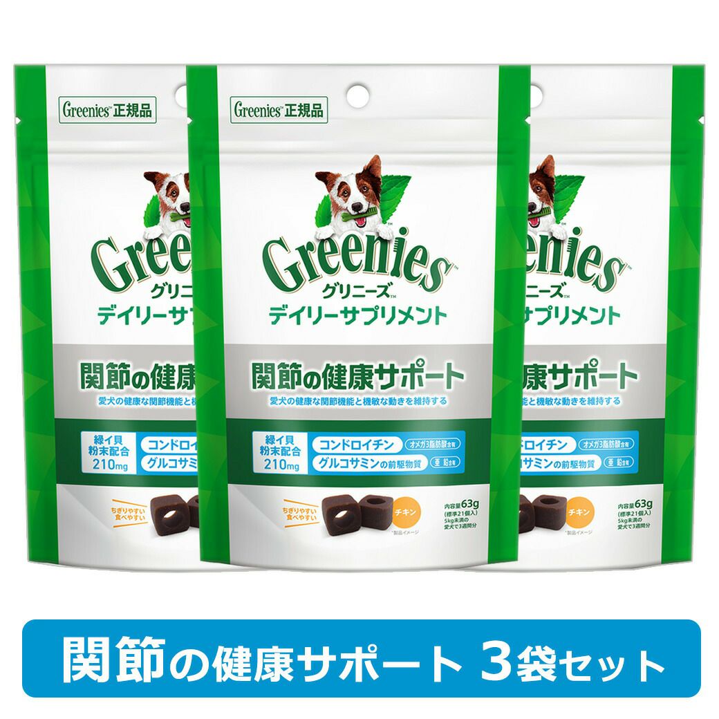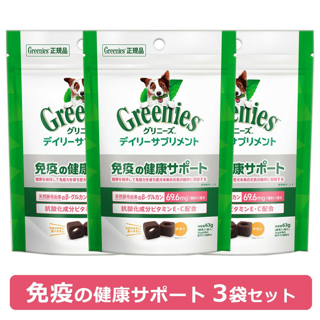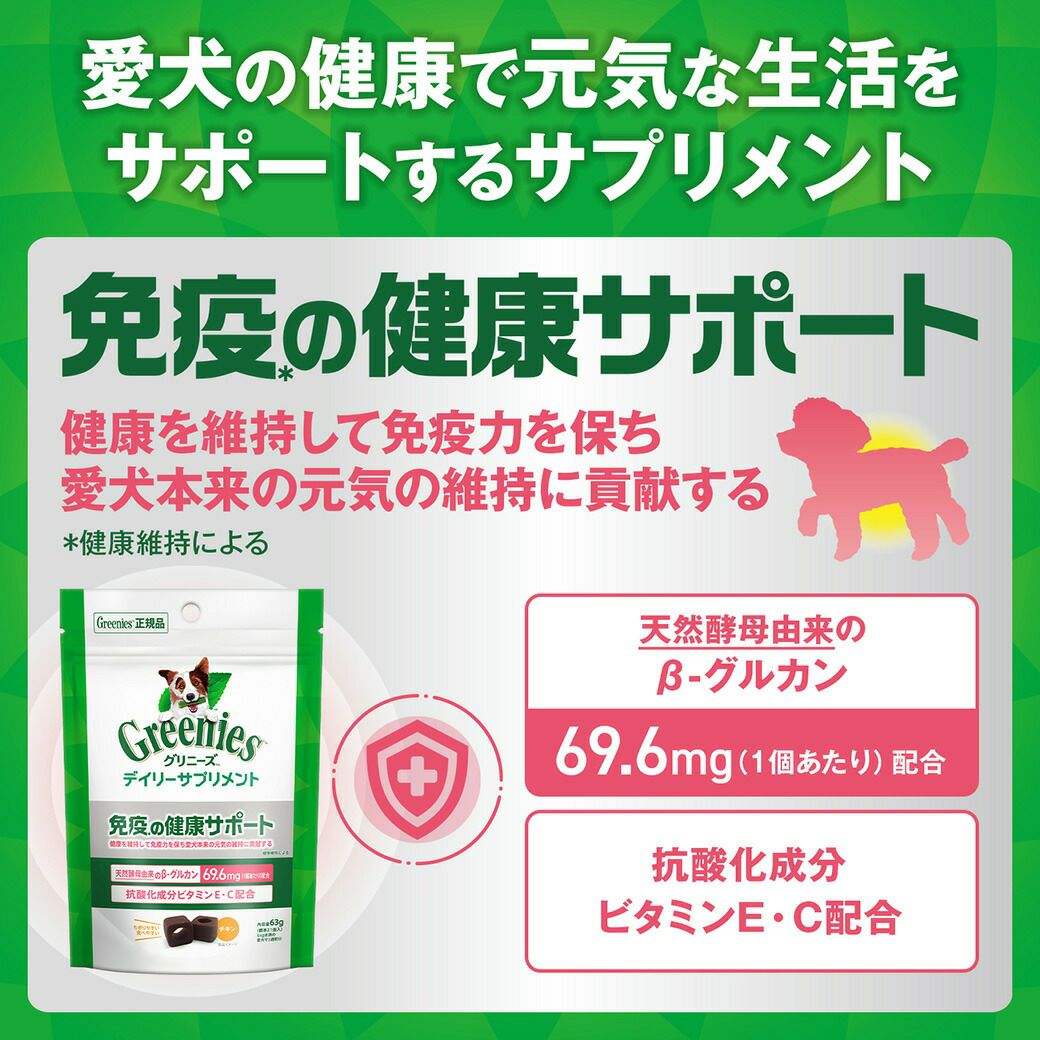 他の画像を見る 賞味期限:単品ページにて掲載 公認店 グリニーズ デイリーサプリメント 関節 おなか 免疫の健康サポート チキン 63g×3袋セット 犬用サプリメント 価格 ¥ 3,234 税込 グリニーズから新登場のデイリーサプリメント3袋セット! ちぎりやすく・食べやすい設計で、負担なく与えられるデイリーサプリメントです。 【関節の健康サポート チキン 63g】 ●緑イ貝粉末210mg配合 ●コンドロイチン、オメガ3脂肪酸含有 ●グルコサミンの前駆物質、亜鉛含有 ■原材料 小麦でん粉、小麦粉、とうもろこし粉、小麦グルテン、大豆ミール、緑イ貝粉末、チキン、食塩、植物性油脂、グリセリン、ビタミン類(C、E)、保存料(ソルビン酸K)、酸化防止剤(ミックストコフェロール、ローズマリー抽出物)コンドロイチン、グルコサミン前駆物質、オメガ3脂肪酸、亜鉛含む ■保証成分 タンパク質:20.0%以上、脂質:3.0%以上、粗繊維:2.0%以下、灰分:8.0%以下、水分:22.0%以下 ■エネルギー:8kcal/1個 ■内容量:63g(標準21個入) ■給与対象:全犬種・成犬 ■原産国:タイ 【おなかの健康サポート チキン 63g】 ●プロバイオティクス46mg配合 ●天然由来のフラクトオリゴ糖162mg配合 ■原材料 小麦でん粉、小麦グルテン、大豆ミール、とうもろこし粉、フラクトオリゴ糖、小麦粉、チキン、食塩、植物性油脂、グリセリン、バチルス菌、保存料(ソルビン酸K)、酸化防止剤(ミックストコフェロール、ローズマリー抽出物) ■保証成分 タンパク質:17.0%以上、脂質:2.0%以上、粗繊維:2.0%以下、灰分:8.0%以下、水分:22.0%以下 ■エネルギー:8kcal/1個 ■内容量:63g(標準21個入) ■給与対象:全犬種・成犬 ■原産国:タイ 【免疫の健康サポート チキン 63g】 ●天然酵母由来のβ-グルカン69.6mg(1個あたり)配合 ●抗酸化成分ビタミンE・C配合 ■原材料 小麦でん粉、小麦粉、とうもろこし粉、小麦グルテン、大豆ミール、チキン、β-グルカン、食塩、植物性油脂、グリセリン、ビタミン類(C、E)、保存料(ソルビン酸K)、酸化防止剤(ミックストコフェロール、ローズマリー抽出物) ■保証成分 タンパク質:18.0%以上、脂質:2.5%以上、粗繊維:2.0%以下、灰分:8.0%以下、水分:22.0%以下 ■エネルギー:8kcal/1個 ■内容量:63g(標準21個入) ■給与対象:全犬種・成犬 ■原産国:タイ ■1日あたりの給与量の目安 【体重】 1.3-5kg未満:1個 5-10kg未満:2個 10-15kg未満:3個 15-20kg未満:4個 5kg未満の愛犬には手でちぎって食べやすい大きさにして与えてください。 1歳未満の幼犬には与えないでください。 過剰に給与することはさけ、1日の目安量を守ってください。 常に清潔で新鮮な飲み水をご用意ください。 ■給与方法・ご注意事項 誤食防止のため、小児の手の届かない場所に保管してください。 開封後は直射日光・高温多湿を避けて保存し、なるべく早く使い切ってください。 虫が入らないように、しっかり密封してください。 カートに入れる お気に入りに登録する