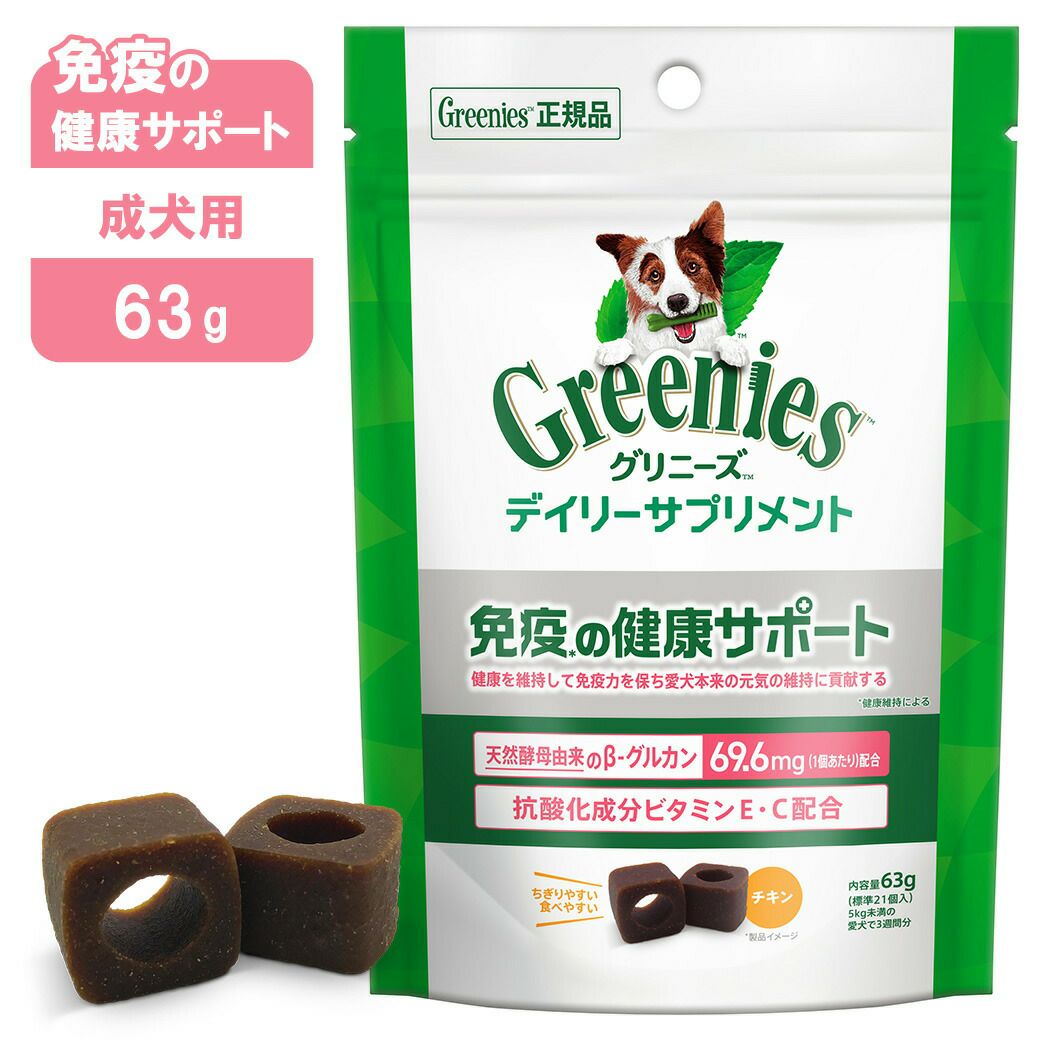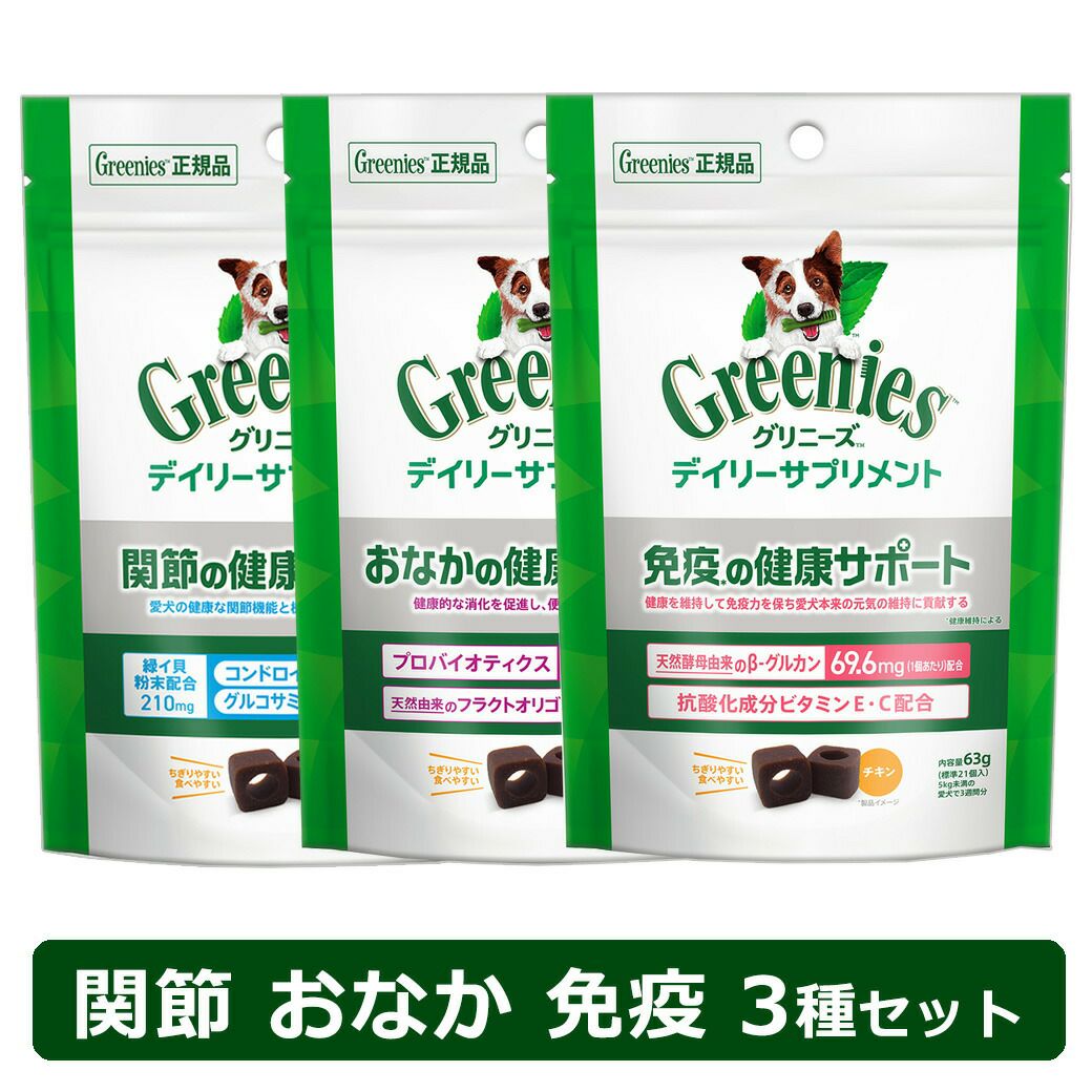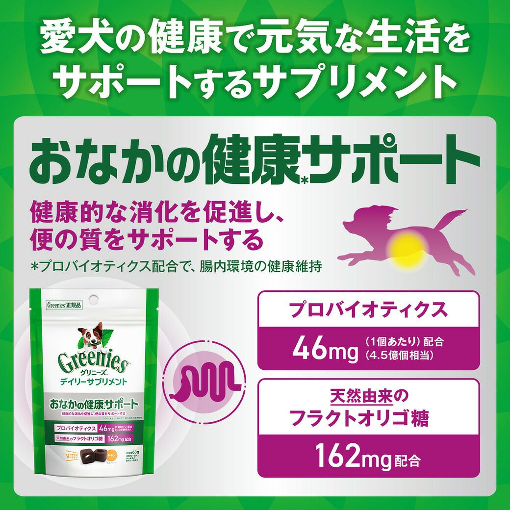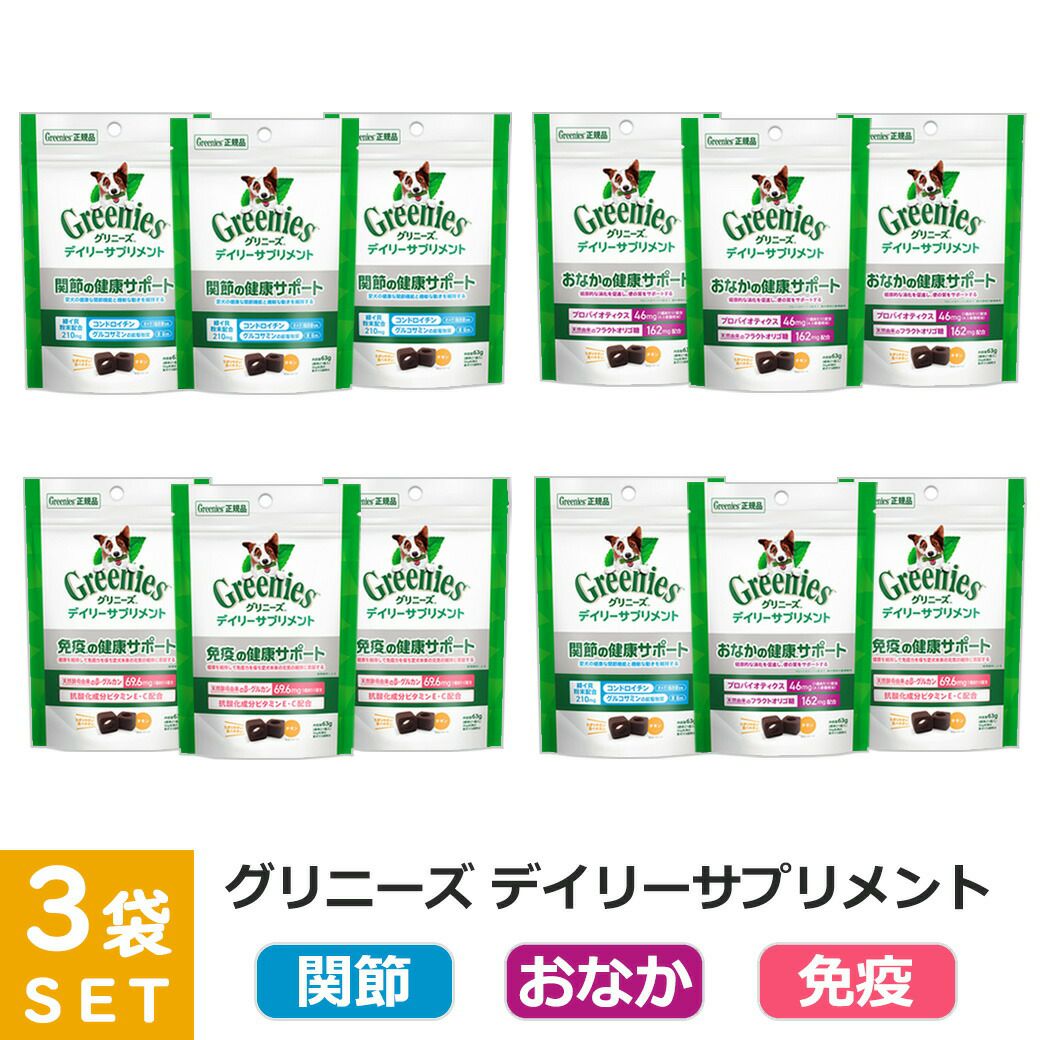 他の画像を見る 賞味期限:単品ページにて掲載 公認店 グリニーズ デイリーサプリメント 関節 おなか 免疫の健康サポート チキン 63g×3袋セット 犬用サプリメント 価格 ¥ 3,234 税込 グリニーズから新登場のデイリーサプリメント3袋セット! ちぎりやすく・食べやすい設計で、負担なく与えられるデイリーサプリメントです。 【関節の健康サポート チキン 63g】 ●緑イ貝粉末210mg配合 ●コンドロイチン、オメガ3脂肪酸含有 ●グルコサミンの前駆物質、亜鉛含有 ■原材料 小麦でん粉、小麦粉、とうもろこし粉、小麦グルテン、大豆ミール、緑イ貝粉末、チキン、食塩、植物性油脂、グリセリン、ビタミン類(C、E)、保存料(ソルビン酸K)、酸化防止剤(ミックストコフェロール、ローズマリー抽出物)コンドロイチン、グルコサミン前駆物質、オメガ3脂肪酸、亜鉛含む ■保証成分 タンパク質:20.0%以上、脂質:3.0%以上、粗繊維:2.0%以下、灰分:8.0%以下、水分:22.0%以下 ■エネルギー:8kcal/1個 ■内容量:63g(標準21個入) ■給与対象:全犬種・成犬 ■原産国:タイ 【おなかの健康サポート チキン 63g】 ●プロバイオティクス46mg配合 ●天然由来のフラクトオリゴ糖162mg配合 ■原材料 小麦でん粉、小麦グルテン、大豆ミール、とうもろこし粉、フラクトオリゴ糖、小麦粉、チキン、食塩、植物性油脂、グリセリン、バチルス菌、保存料(ソルビン酸K)、酸化防止剤(ミックストコフェロール、ローズマリー抽出物) ■保証成分 タンパク質:17.0%以上、脂質:2.0%以上、粗繊維:2.0%以下、灰分:8.0%以下、水分:22.0%以下 ■エネルギー:8kcal/1個 ■内容量:63g(標準21個入) ■給与対象:全犬種・成犬 ■原産国:タイ 【免疫の健康サポート チキン 63g】 ●天然酵母由来のβ-グルカン69.6mg(1個あたり)配合 ●抗酸化成分ビタミンE・C配合 ■原材料 小麦でん粉、小麦粉、とうもろこし粉、小麦グルテン、大豆ミール、チキン、β-グルカン、食塩、植物性油脂、グリセリン、ビタミン類(C、E)、保存料(ソルビン酸K)、酸化防止剤(ミックストコフェロール、ローズマリー抽出物) ■保証成分 タンパク質:18.0%以上、脂質:2.5%以上、粗繊維:2.0%以下、灰分:8.0%以下、水分:22.0%以下 ■エネルギー:8kcal/1個 ■内容量:63g(標準21個入) ■給与対象:全犬種・成犬 ■原産国:タイ ■1日あたりの給与量の目安 【体重】 1.3-5kg未満:1個 5-10kg未満:2個 10-15kg未満:3個 15-20kg未満:4個 5kg未満の愛犬には手でちぎって食べやすい大きさにして与えてください。 1歳未満の幼犬には与えないでください。 過剰に給与することはさけ、1日の目安量を守ってください。 常に清潔で新鮮な飲み水をご用意ください。 ■給与方法・ご注意事項 誤食防止のため、小児の手の届かない場所に保管してください。 開封後は直射日光・高温多湿を避けて保存し、なるべく早く使い切ってください。 虫が入らないように、しっかり密封してください。 カートに入れる お気に入りに登録する