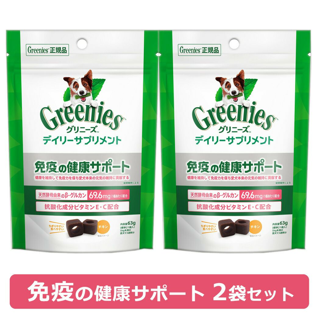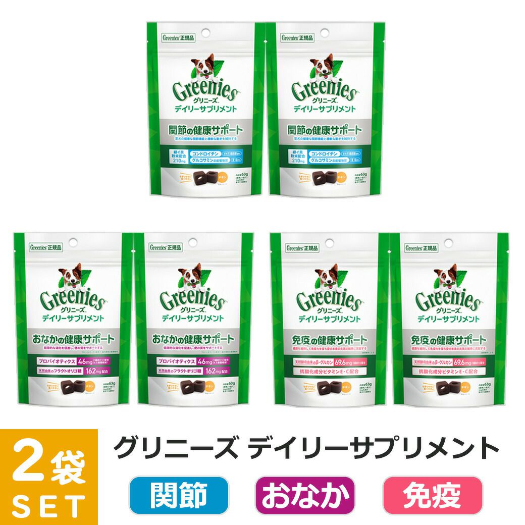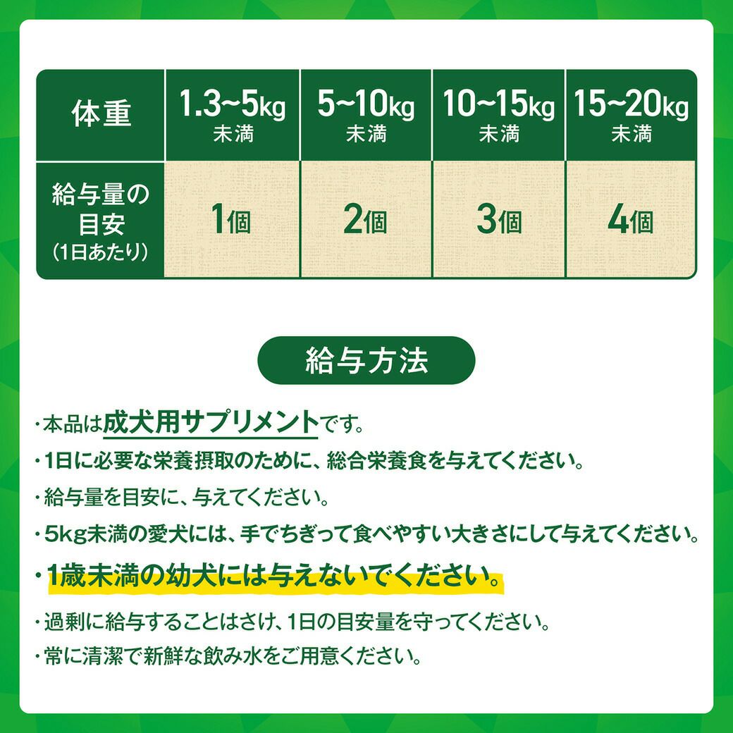 他の画像を見る 賞味期限:単品ページにて掲載 公認店 グリニーズ デイリーサプリメント 関節 おなか 免疫の健康サポート チキン 63g×2袋セット 犬用サプリメント 価格 ¥ 2,156 税込 グリニーズから新登場のデイリーサプリメント2袋セット! ちぎりやすく・食べやすい設計で、負担なく与えられるデイリーサプリメントです。 【関節の健康サポート チキン 63g】 ●緑イ貝粉末210mg配合 ●コンドロイチン、オメガ3脂肪酸含有 ●グルコサミンの前駆物質、亜鉛含有 ■原材料 小麦でん粉、小麦粉、とうもろこし粉、小麦グルテン、大豆ミール、緑イ貝粉末、チキン、食塩、植物性油脂、グリセリン、ビタミン類(C、E)、保存料(ソルビン酸K)、酸化防止剤(ミックストコフェロール、ローズマリー抽出物)コンドロイチン、グルコサミン前駆物質、オメガ3脂肪酸、亜鉛含む ■保証成分 タンパク質:20.0%以上、脂質:3.0%以上、粗繊維:2.0%以下、灰分:8.0%以下、水分:22.0%以下 ■エネルギー:8kcal/1個 ■内容量:63g(標準21個入) ■給与対象:全犬種・成犬 ■原産国:タイ 【おなかの健康サポート チキン 63g】 ●プロバイオティクス46mg配合 ●天然由来のフラクトオリゴ糖162mg配合 ■原材料 小麦でん粉、小麦グルテン、大豆ミール、とうもろこし粉、フラクトオリゴ糖、小麦粉、チキン、食塩、植物性油脂、グリセリン、バチルス菌、保存料(ソルビン酸K)、酸化防止剤(ミックストコフェロール、ローズマリー抽出物) ■保証成分 タンパク質:17.0%以上、脂質:2.0%以上、粗繊維:2.0%以下、灰分:8.0%以下、水分:22.0%以下 ■エネルギー:8kcal/1個 ■内容量:63g(標準21個入) ■給与対象:全犬種・成犬 ■原産国:タイ 【免疫の健康サポート チキン 63g】 ●天然酵母由来のβ-グルカン69.6mg(1個あたり)配合 ●抗酸化成分ビタミンE・C配合 ■原材料 小麦でん粉、小麦粉、とうもろこし粉、小麦グルテン、大豆ミール、チキン、β-グルカン、食塩、植物性油脂、グリセリン、ビタミン類(C、E)、保存料(ソルビン酸K)、酸化防止剤(ミックストコフェロール、ローズマリー抽出物) ■保証成分 タンパク質:18.0%以上、脂質:2.5%以上、粗繊維:2.0%以下、灰分:8.0%以下、水分:22.0%以下 ■エネルギー:8kcal/1個 ■内容量:63g(標準21個入) ■給与対象:全犬種・成犬 ■原産国:タイ ■1日あたりの給与量の目安 【体重】 1.3-5kg未満:1個 5-10kg未満:2個 10-15kg未満:3個 15-20kg未満:4個 5kg未満の愛犬には手でちぎって食べやすい大きさにして与えてください。 1歳未満の幼犬には与えないでください。 過剰に給与することはさけ、1日の目安量を守ってください。 常に清潔で新鮮な飲み水をご用意ください。 ■給与方法・ご注意事項 誤食防止のため、小児の手の届かない場所に保管してください。 開封後は直射日光・高温多湿を避けて保存し、なるべく早く使い切ってください。 虫が入らないように、しっかり密封してください。 カートに入れる お気に入りに登録する