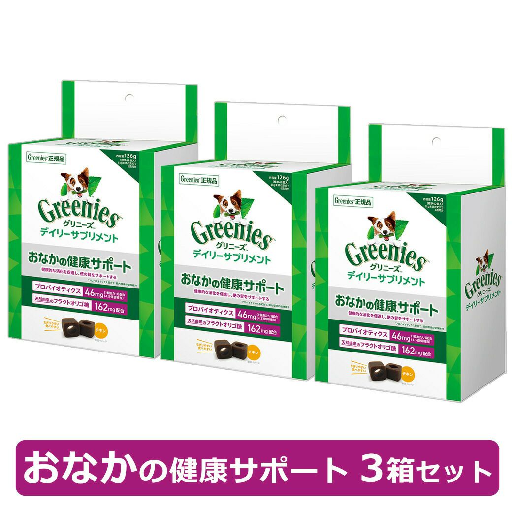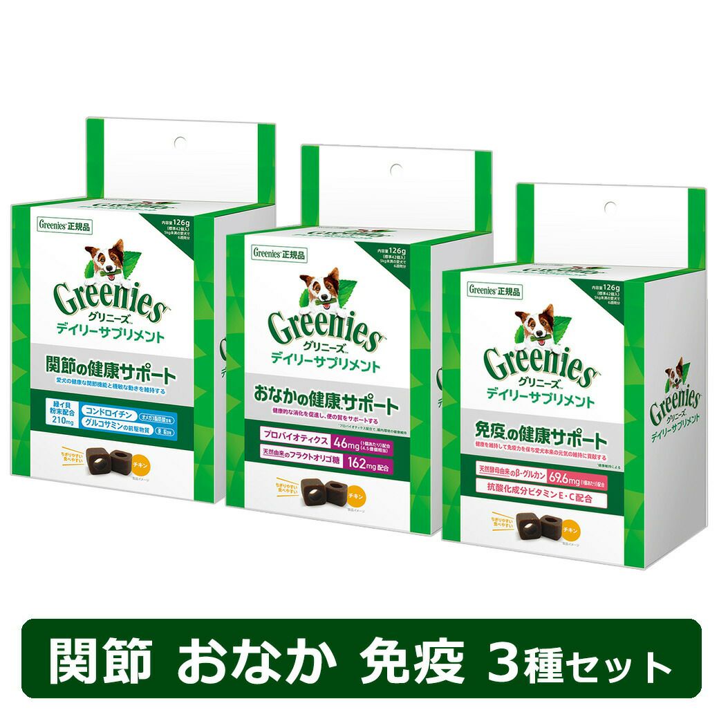 他の画像を見る 賞味期限:単品ページにて掲載 公認店 グリニーズ デイリーサプリメント 関節 おなか 免疫の健康サポート チキン 126g×3箱セット 犬用サプリメント 価格 ¥ 5,874 税込 グリニーズから新登場のデイリーサプリメント3箱セット! ちぎりやすく・食べやすい設計で、負担なく与えられるデイリーサプリメントです。 【関節の健康サポート チキン 126g】 ●緑イ貝粉末210mg配合 ●コンドロイチン、オメガ3脂肪酸含有 ●グルコサミンの前駆物質、亜鉛含有 ■原材料 小麦でん粉、小麦粉、とうもろこし粉、小麦グルテン、大豆ミール、緑イ貝粉末、チキン、食塩、植物性油脂、グリセリン、ビタミン類(C、E)、保存料(ソルビン酸K)、酸化防止剤(ミックストコフェロール、ローズマリー抽出物)コンドロイチン、グルコサミン前駆物質、オメガ3脂肪酸、亜鉛含む ■保証成分 タンパク質:20.0%以上、脂質:3.0%以上、粗繊維:2.0%以下、灰分:8.0%以下、水分:22.0%以下 ■エネルギー:8kcal/1個 ■内容量:126g(標準42個入) ■給与対象:全犬種・成犬 ■原産国:タイ 【おなかの健康サポート チキン 126g】 ●プロバイオティクス46mg配合 ●天然由来のフラクトオリゴ糖162mg配合 ■原材料 小麦でん粉、小麦グルテン、大豆ミール、とうもろこし粉、フラクトオリゴ糖、小麦粉、チキン、食塩、植物性油脂、グリセリン、バチルス菌、保存料(ソルビン酸K)、酸化防止剤(ミックストコフェロール、ローズマリー抽出物) ■保証成分 タンパク質:17.0%以上、脂質:2.0%以上、粗繊維:2.0%以下、灰分:8.0%以下、水分:22.0%以下 ■エネルギー:8kcal/1個 ■内容量:126g(標準42個入) ■給与対象:全犬種・成犬 ■原産国:タイ 【免疫の健康サポート チキン 126g】 ●天然酵母由来のβ-グルカン69.6mg(1個あたり)配合 ●抗酸化成分ビタミンE・C配合 ■原材料 小麦でん粉、小麦粉、とうもろこし粉、小麦グルテン、大豆ミール、チキン、β-グルカン、食塩、植物性油脂、グリセリン、ビタミン類(C、E)、保存料(ソルビン酸K)、酸化防止剤(ミックストコフェロール、ローズマリー抽出物) ■保証成分 タンパク質:18.0%以上、脂質:2.5%以上、粗繊維:2.0%以下、灰分:8.0%以下、水分:22.0%以下 ■エネルギー:8kcal/1個 ■内容量:126g(標準42個入) ■給与対象:全犬種・成犬 ■原産国:タイ ■1日あたりの給与量の目安 【体重】 1.3-5kg未満:1個 5-10kg未満:2個 10-15kg未満:3個 15-20kg未満:4個 5kg未満の愛犬には手でちぎって食べやすい大きさにして与えてください。 1歳未満の幼犬には与えないでください。 過剰に給与することはさけ、1日の目安量を守ってください。 常に清潔で新鮮な飲み水をご用意ください。 ■給与方法・ご注意事項 誤食防止のため、小児の手の届かない場所に保管してください。 開封後は直射日光・高温多湿を避けて保存し、なるべく早く使い切ってください。 虫が入らないように、しっかり密封してください。 カートに入れる お気に入りに登録する