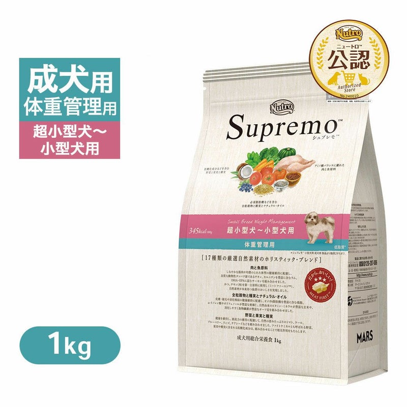 シュプレモ 超小型犬~小型犬用 体重管理用は、太りやすく体重が気になる超小型犬~小型犬のために脂質を抑え、さらに食事量を減らしても必須栄養素がしっかり取れるように栄養設計しつつ、チキン(肉)を原材料として一番多く使用することで、自然素材本来のおいしさを存分に味わうことができるフードです。健康で元気な体、美しい皮膚・被毛、消化吸収の健康維持に配慮し、栄養素を豊富に含む高品質な自然素材を厳選し、最適な栄養バランスでブレンドしています。また、顎・口が小さいなどの超小型犬~小型犬の特徴に配慮しています。【超小型犬~小型犬に適した小粒タイプ】