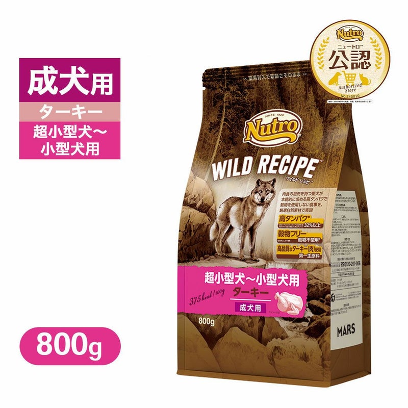ニュートロ ワイルド レシピは、愛犬の祖先の食事に着目し、愛犬が本能的に求める高タンパクで穀物を使わない食事を、ターキー(肉)をはじめとする高品質な厳選自然素材で作りました。