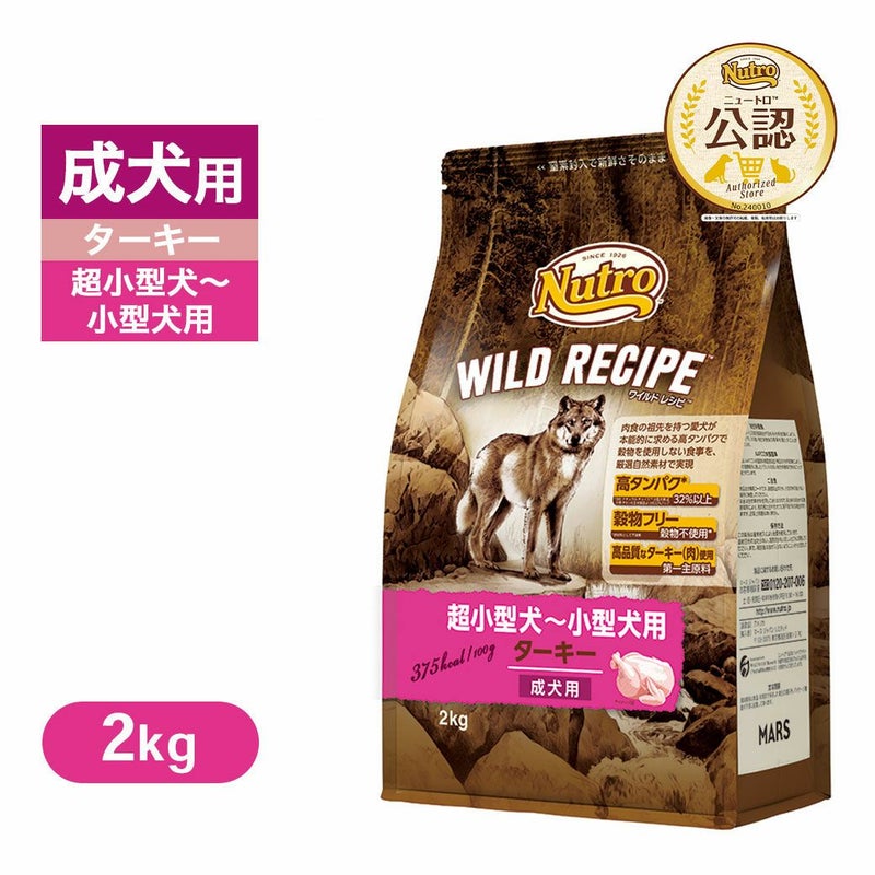 ニュートロ ワイルド レシピは、愛犬の祖先の食事に着目し、愛犬が本能的に求める高タンパクで穀物を使わない食事を、ターキー(肉)をはじめとする高品質な厳選自然素材で作りました。