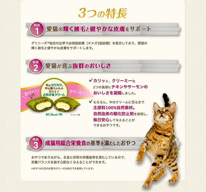 グリニーズ独自の比率で必須脂肪酸(オメガ3脂肪酸)を配合しており、愛猫の