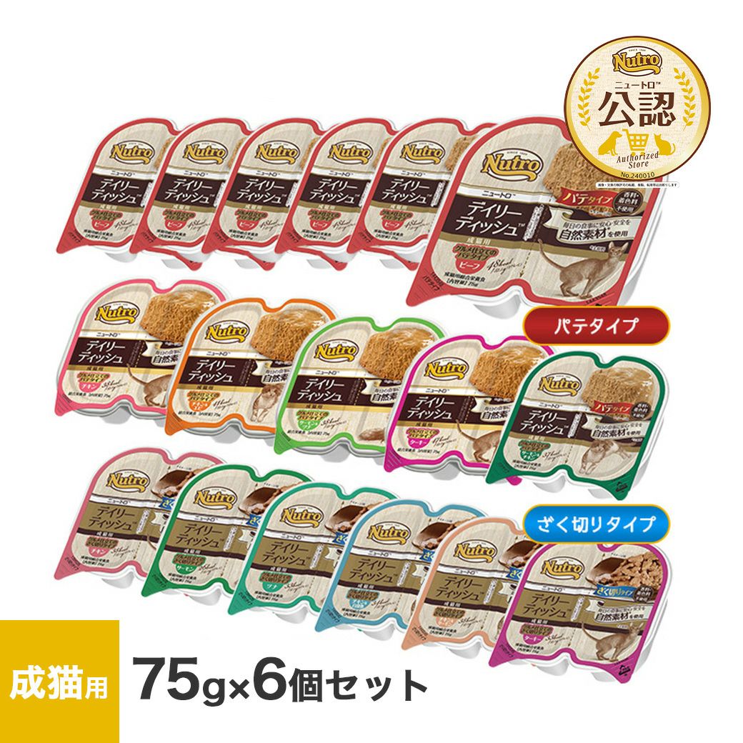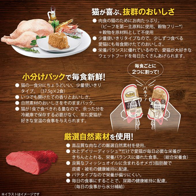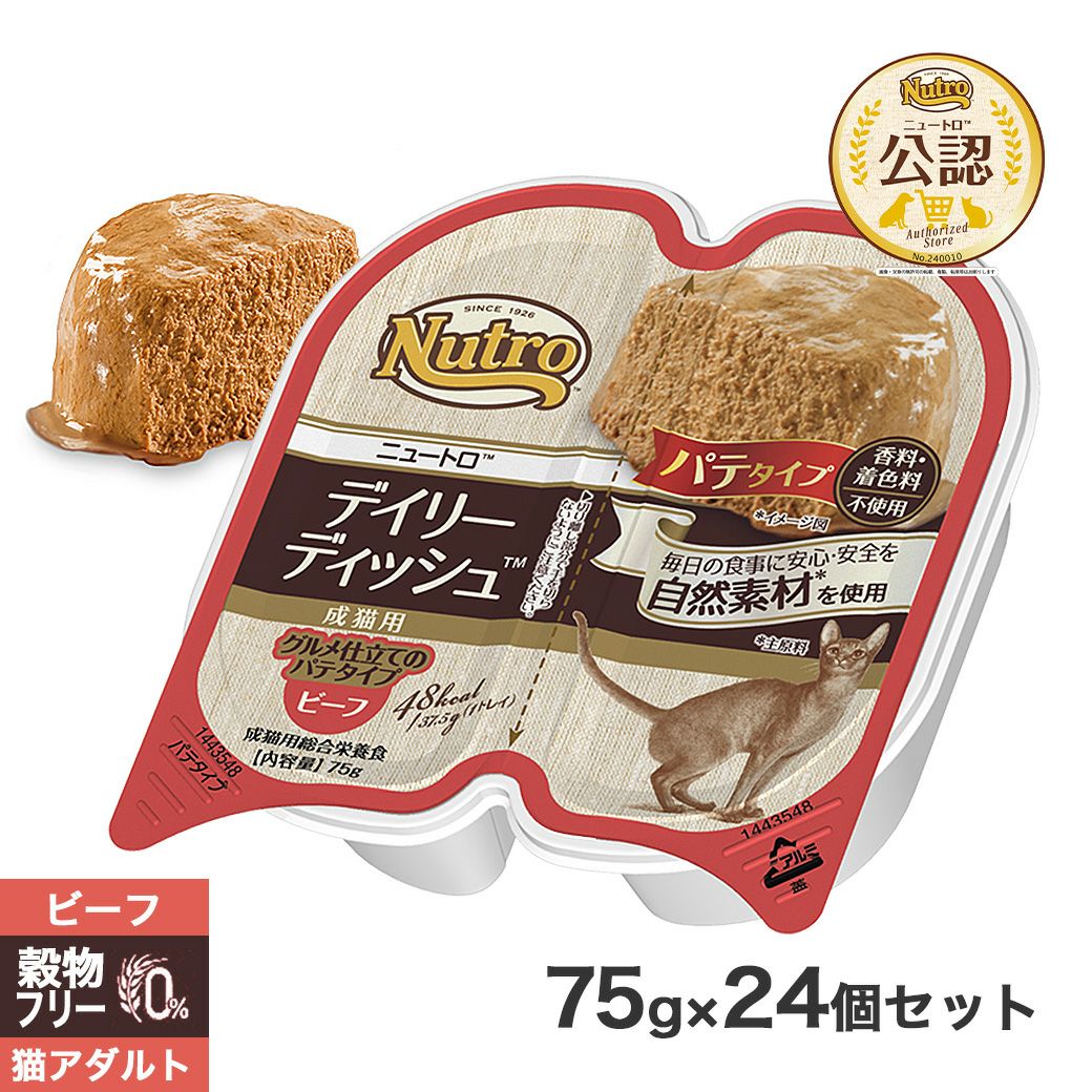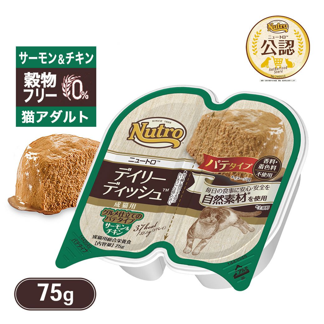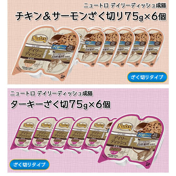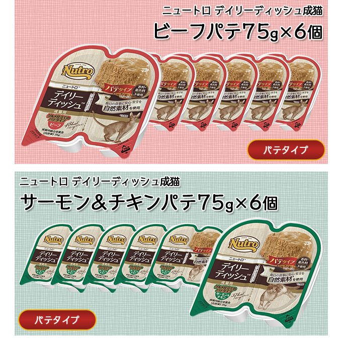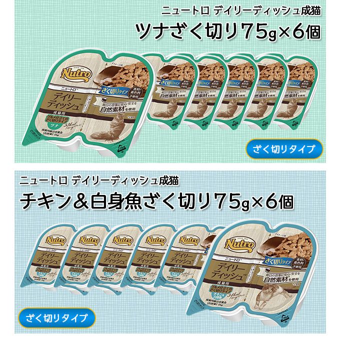 他の画像を見る ニュートロ デイリーディッシュ 成猫用 グルメ仕立て トレイ 75g×6個セット ●パテタイプの総合栄養食。小分けパックで毎日新鮮! 公認店 ニュートロ デイリーディッシュ 成猫用 グルメ仕立て トレイ 75g×6個セット 価格 ¥ 1,272 税込 グルメ仕立てのパテ&ざく切りタイプ♪ 猫の一食分にちょうどいい小分けパックで毎日新鮮! 水とデイリーディッシュだけで毎日必要な栄養がきちんととれる総合栄養食です。肉食の愛猫のためにお肉たっぷり!ビーフを第一主原料に使用し、穀物フリー。 猫の一食分にちょうどいい少量使い切りタイプなのでいつでも開けたての香りとおいしさ♪余りを冷蔵庫で保存せず、常に猫が好きな室温の食事を与えることができます。 ■セット内容【 ニュートロ デイリーディッシュ 成猫用 トレイ 】 ・ビーフ パテタイプ×6個セット ・サーモン&チキン パテタイプ×6個セット ・チキン ざく切り×6個セット ・サーモン ざく切り×6個セット ・ツナ ざく切り×6個セット ・チキン&白身魚 ざく切り×6個セット ・チキン&サーモン ざく切り×6個セット ・ターキー ざく切り×6個セット ・チキン パテタイプ×6個セット ・チキン&エビ パテタイプ×6個セット ・サーモン&ツナ パテタイプ×6個セット ・ターキー パテタイプ×6個セット ■総合栄養食 本品は、ペットフード公正取引協議会の定める分析試験の結果、総合栄養食の基準を満たすことが証明されています。 ■AAFCO栄養基準 本品は、AAFCO(米国飼料検査官協会)規定の分析試験により、健康維持に適したバランスの良い総合栄養食であることが証明されています。 ■原産国:アメリカ ※原材料・成分値は各商品の単品ページにてご確認ください。 <ニュートロ デイリーディッシュ 成猫用 トレイ【単品】> ●なめらか食感で食べやすい「パテタイプ」 ビーフ ┃ サーモン&チキン ┃ サーモン&ツナ チキン ┃ チキン&エビ ┃ ターキー ●噛み応えのある食感で満足感がある「ざく切りタイプ」 サーモン ┃ チキン&サーモン ┃ ツナ ターキー ┃ チキン&白身魚 ┃ チキン ⇒猫用フードボウル(食器)はコチラ カートに入れる お気に入りに登録する
