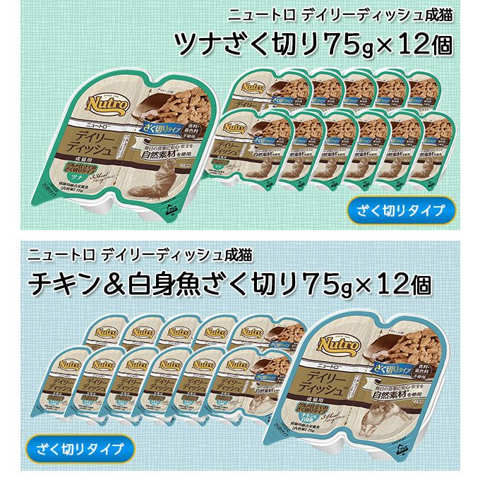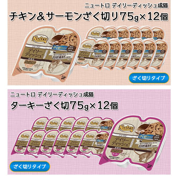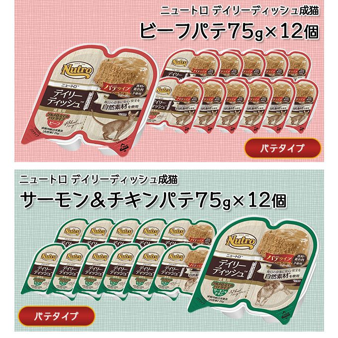 他の画像を見る ニュートロ デイリーディッシュ 成猫用 グルメ仕立て トレイ 75g×12個セット ●パテタイプの総合栄養食。小分けパックで毎日新鮮! 公認店 ニュートロ デイリーディッシュ 成猫用 グルメ仕立て トレイ 75g×12個セット 価格 ¥ 2,544 税込 グルメ仕立てのパテ&ざく切りタイプ♪ 猫の一食分にちょうどいい小分けパックで毎日新鮮! 水とデイリーディッシュだけで毎日必要な栄養がきちんととれる総合栄養食です。肉食の愛猫のためにお肉たっぷり!ビーフを第一主原料に使用し、穀物フリー。 猫の一食分にちょうどいい少量使い切りタイプなのでいつでも開けたての香りとおいしさ♪余りを冷蔵庫で保存せず、常に猫が好きな室温の食事を与えることができます。 ■セット内容【 ニュートロ デイリーディッシュ 成猫用 トレイ 】 ・ビーフ パテタイプ×12個セット ・サーモン&チキン パテタイプ×12個セット ・チキン ざく切り×12個セット ・サーモン ざく切り×12個セット ・ツナ ざく切り×12個セット ・チキン&白身魚 ざく切り×12個セット ・チキン&サーモン ざく切り×12個セット ・ターキー ざく切り×12個セット ・チキン パテタイプ×12個セット ・チキン&エビ パテタイプ×12個セット ・サーモン&ツナ パテタイプ×12個セット ・ターキー パテタイプ×12個セット ・12種類を各1個ずつ 計12個セット ■総合栄養食 本品は、ペットフード公正取引協議会の定める分析試験の結果、総合栄養食の基準を満たすことが証明されています。 ■AAFCO栄養基準 本品は、AAFCO(米国飼料検査官協会)規定の分析試験により、健康維持に適したバランスの良い総合栄養食であることが証明されています。 ■原産国:アメリカ ※原材料・成分値は各商品の単品ページにてご確認ください。 <ニュートロ デイリーディッシュ 成猫用 トレイ【単品】> ●なめらか食感で食べやすい「パテタイプ」 ビーフ ┃ サーモン&チキン ┃ サーモン&ツナ チキン ┃ チキン&エビ ┃ ターキー ●噛み応えのある食感で満足感がある「ざく切りタイプ」 サーモン ┃ チキン&サーモン ┃ ツナ ターキー ┃ チキン&白身魚 ┃ チキン ⇒猫用フードボウル(食器)はコチラ カートに入れる お気に入りに登録する
