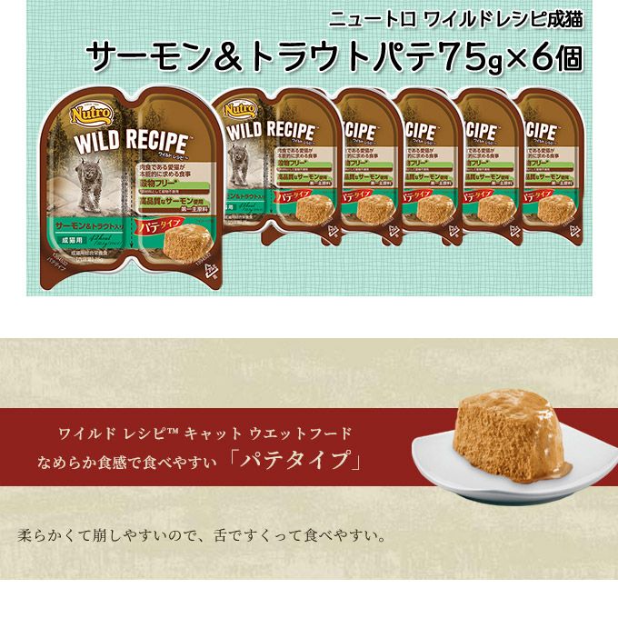 他の画像を見る ニュートロ ワイルドレシピ キャットフード 成猫用 サーモン&トラウト入り パテタイプ 75g×24個 ●高タンパクで穀物を使用しない食事を厳選自然素材で実現! 公認店 ニュートロ ワイルドレシピ キャットフード 成猫用 サーモン&トラウト入り パテタイプ 75g×24個 価格 ¥ 6,072 税込 肉食である愛猫が本能的に求める食事 肉食の猫が野生のころから食べている高タンパクで穀物を使用しない食事を高品質な厳選自然素材で作りました。 肉食である猫のネイチャー(本質)に着目し、野生のころから食べている食事を、最新の栄養学と技術を持って、厳選素材を使用して作りました。 猫の一食分にちょうどいい、少量使いきりタイプ。 愛猫の本能に訴え、愛猫が自ら選びに来る食事を、ぜひお試しください。 ■高タンパク ■穀物フリー ■肉や魚を第一主原料に使用 ■厳選素材を使用 ⇒猫用フードボウル(食器)はコチラ ●いつでもキレイでおいしい水を!ピュアクリスタル 【キャットフード 成猫用 アダルト】 【キャットフード ウェット】 カートに入れる お気に入りに登録する