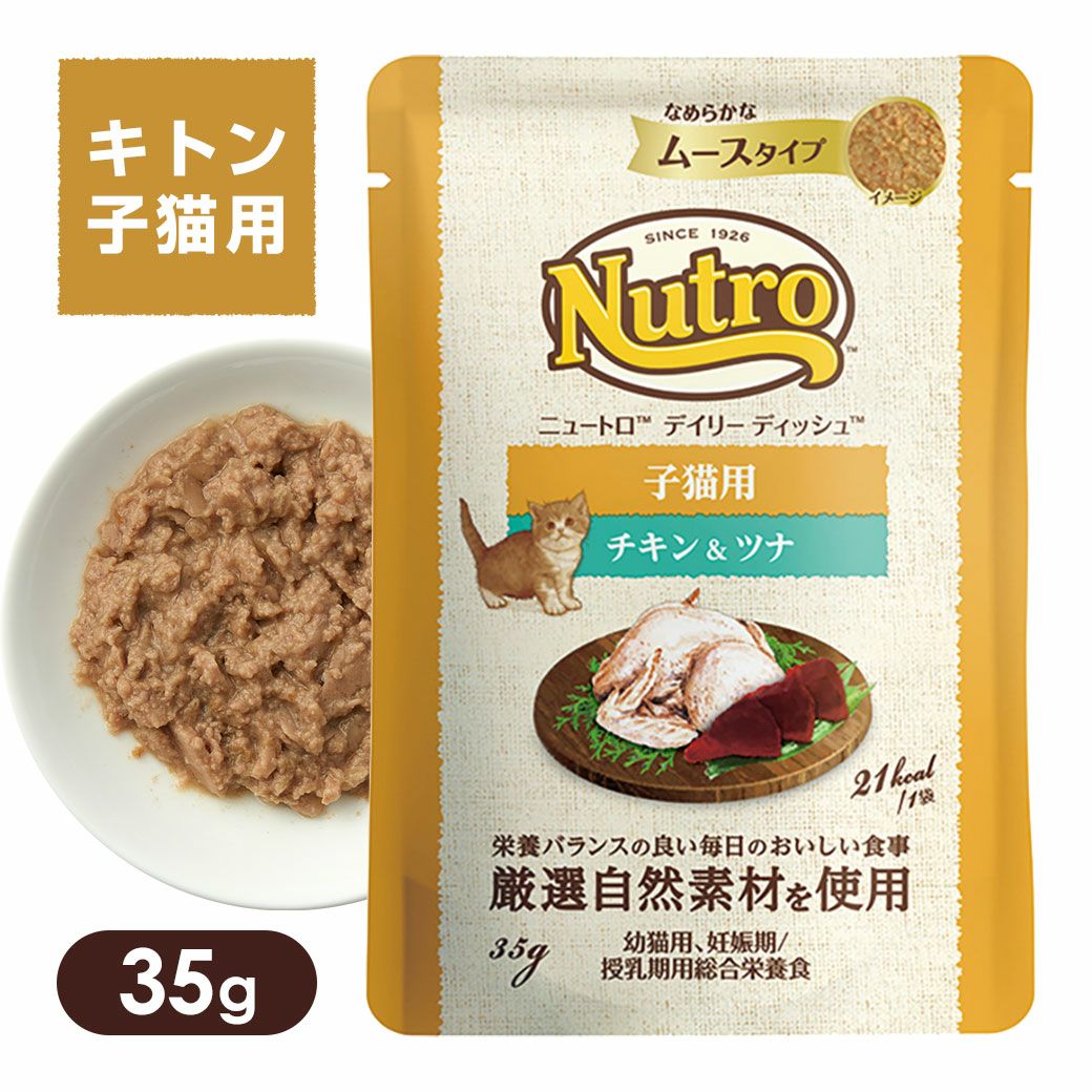 他の画像を見る パウチタイプで毎食新鮮! 公認店 ニュートロ キャット デイリー ディッシュ 子猫用 キトン チキン&ツナ なめらかなムースタイプ パウチ 35g×48個 価格 ¥ 5,280 税込 【商品詳細】 ■原材料:チキン、ツナ(DHA源)、鶏レバー、小麦、調味料(アミノ酸等)、ビタミン類(B1、B2、B6、B12、E、K、コリン、ナイアシン、パントテン酸、ビオチン、葉酸)、ミネラル類(Ca、Cl、Cu、Fe、I、K、Mg、Mn、Na、P、Zn)、タウリン、増粘多糖類 ■保障成分:(粗タンパク質、粗繊維、水分、粗脂肪、粗灰分、代謝エネルギー/100g) 5.5%以上、0.5%以下、90%以下、2%以上、3%以下、21kcal ■内容量:35g×48個 ■原産国:タイ ■賞味期限:24か月 ■1日あたりの給与量の目安 目安体重:2kg、3kg、3.5kg 給与量:12袋、13.5袋、9.5袋 ■給与方法・ご注意事項 ・本製品には、子猫及び授乳期・妊娠期の母猫に必要な栄養がバランスよく含まれていますので、本製品と水のみで毎日の食事として十分です。 ・子猫には、1日の食事量を離乳期は5~6回、成長に伴い徐々に回数を減らし、生後半年頃までに2回程度で与えてください。 【お知らせ】 リニューアルに伴い、パッケージ・内容等予告なく変更する場合がございます。また、リニューアル時期は旧製品と新製品が混同する場合がございます。予めご了承ください。 < おすすめ・関連商品はコチラ > 【子猫用】チキン&ツナ なめらかなムースタイプ 【成猫用】チキン&ツナ グルメ仕立てのざく切りタイプ 【シニア猫用】チキン&ツナ クリーミーなペーストタイプ 【エイジングケア】チキン&ツナ グルメ仕立てのそぼろタイプ カートに入れる お気に入りに登録する