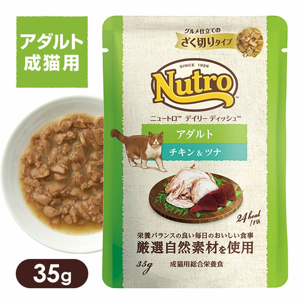 他の画像を見る パウチタイプで毎食新鮮! 公認店 ニュートロ キャット デイリー ディッシュ 成猫用 チキン&ツナ グルメ仕立てのざく切りタイプ パウチ 35g×48個 価格 ¥ 5,280 税込 【商品詳細】 ■原材料:チキン、ツナ、ビーフレバー、鶏レバー、小麦、調味料(アミノ酸等)、ビタミン類(B1、B2、B6、B12、E、K、コリン、ナイアシン、パントテン酸、ビオチン、葉酸)、ミネラル類(Ca、Cl、Cu、Fe、I、K、Mg、Mn、Na、P、Zn)、タウリン、増粘多糖類 ■保障成分:(粗タンパク質、粗繊維、水分、粗脂肪、粗灰分、代謝エネルギー/100g) 8.5%以上、0.5%以下、87%以下、1%以上、3%以下、24kcal ■内容量:35g×48個 ■原産国:タイ ■賞味期限:24か月 ■1日あたりの給与量の目安 目安体重:2kg、3kg、4kg、5kg、7kg 給与量:5.5袋、7.5袋、9袋、10.5袋、13袋 ■給与方法・ご注意事項 ・本製品には、成猫に必要な栄養がバランスよく含まれていますので、本製品と水のみで毎日の食事として十分です。 ・1日の食事量を2回程度に分けて与えてください。 【お知らせ】 リニューアルに伴い、パッケージ・内容等予告なく変更する場合がございます。また、リニューアル時期は旧製品と新製品が混同する場合がございます。予めご了承ください。 < おすすめ・関連商品はコチラ > 【子猫用】チキン&ツナ なめらかなムースタイプ 【成猫用】チキン&ツナ グルメ仕立てのざく切りタイプ 【シニア猫用】チキン&ツナ クリーミーなペーストタイプ 【エイジングケア】チキン&ツナ グルメ仕立てのそぼろタイプ カートに入れる お気に入りに登録する