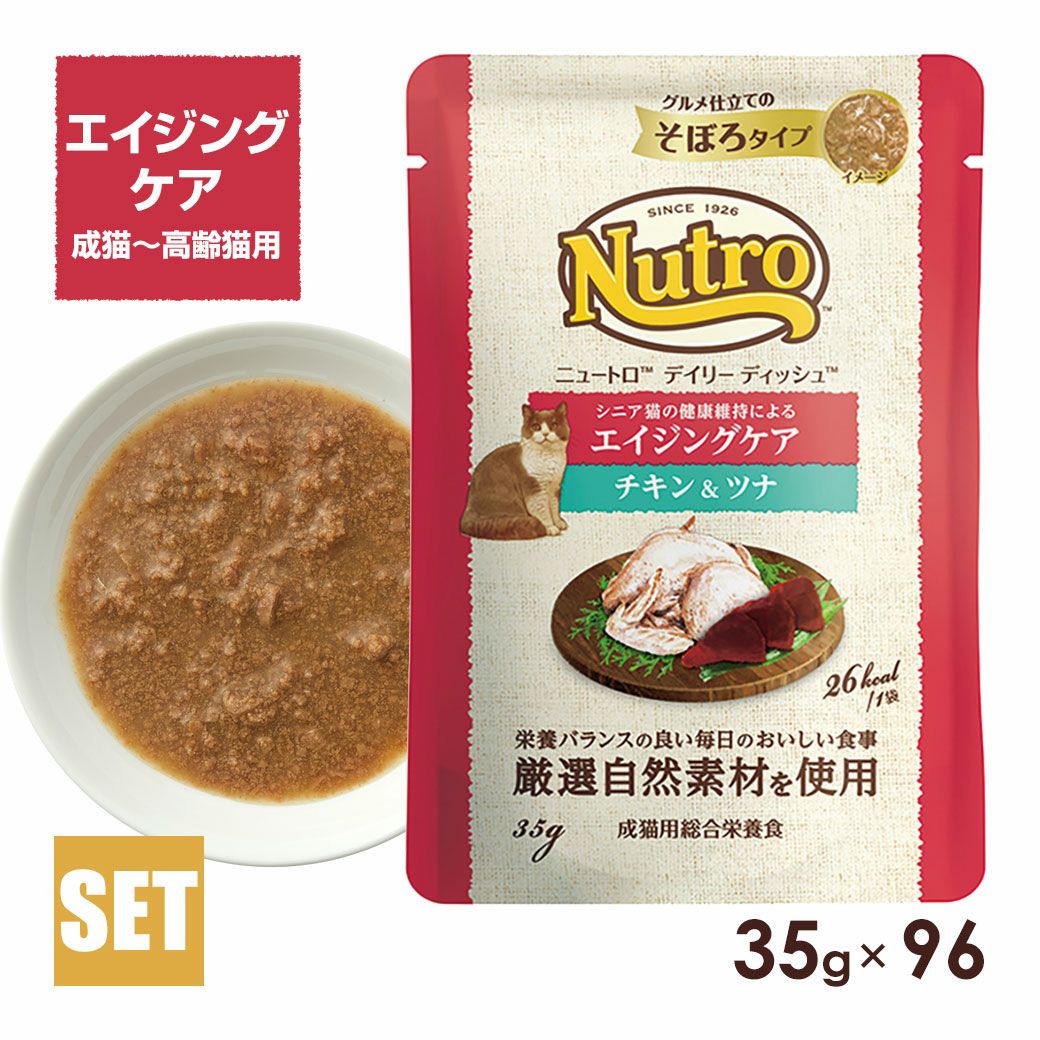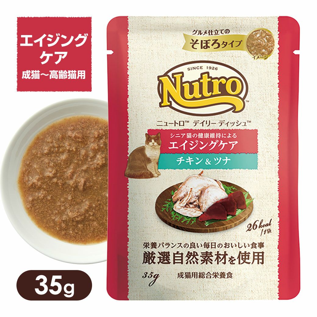 他の画像を見る パウチタイプで毎食新鮮! 公認店 ニュートロ キャット デイリー ディッシュ エイジングケア チキン&ツナ グルメ仕立てのそぼろタイプ パウチ 35g×96個 価格 ¥ 10,560 税込 【商品詳細】 ■原材料:チキン、ツナ、ビーフレバー、鶏レバー、小麦、ひまわり油、グルコサミン、調味料(アミノ酸等)、ビタミン類(B1、B2、B6、B12、E、K、コリン、ナイアシン、パントテン酸、ビオチン、葉酸)、ミネラル類(Ca、Cl、Cu、Fe、I、K、Mg、Mn、Na、P、Zn)、タウリン、増粘多糖類 ■保障成分:(粗タンパク質、粗繊維、水分、粗脂肪、粗灰分、代謝エネルギー/100g) 8.5%以上、0.5%以下、87%以下、1.5%以上、3%以下、26kcal ■内容量:35g×96個 ■原産国:タイ ■賞味期限:24か月 ■1日あたりの給与量の目安 目安体重:2kg、3kg、4kg、5kg、7kg 給与量:5袋、7袋、8.5袋、9.5袋、12.5袋 ■給与方法・ご注意事項 ・本製品には、成猫に必要な栄養がバランスよく含まれていますので、本製品と水のみで毎日の食事として十分です。 ・1日の食事量を2回程度に分けて与えてください。 【お知らせ】 リニューアルに伴い、パッケージ・内容等予告なく変更する場合がございます。また、リニューアル時期は旧製品と新製品が混同する場合がございます。予めご了承ください。 < おすすめ・関連商品はコチラ > 【子猫用】チキン&ツナ なめらかなムースタイプ 【成猫用】チキン&ツナ グルメ仕立てのざく切りタイプ 【シニア猫用】チキン&ツナ クリーミーなペーストタイプ 【エイジングケア】チキン&ツナ グルメ仕立てのそぼろタイプ カートに入れる お気に入りに登録する