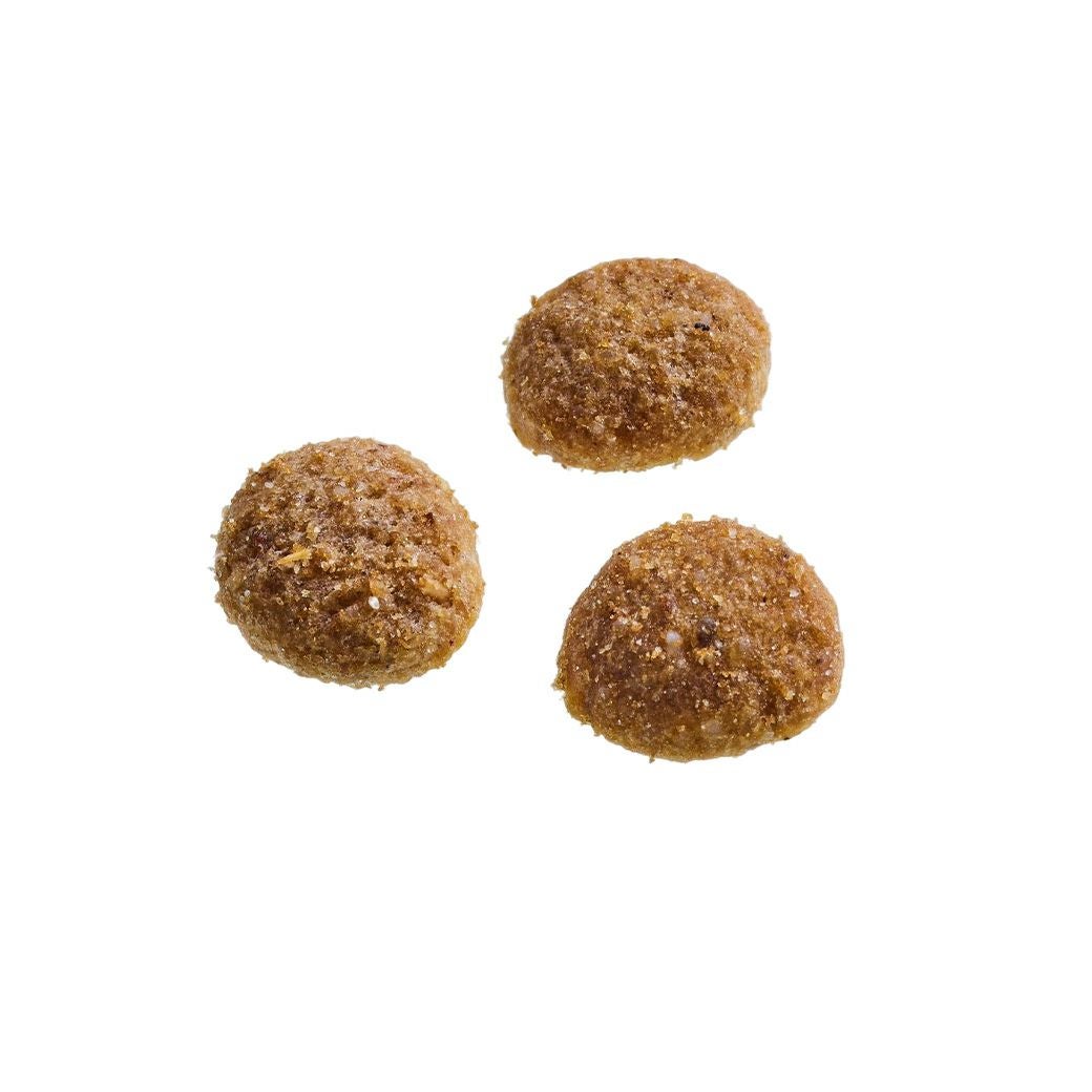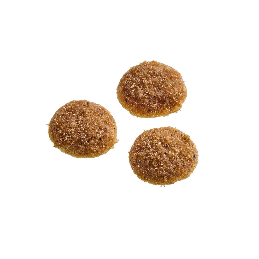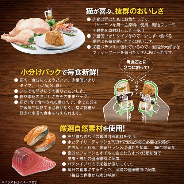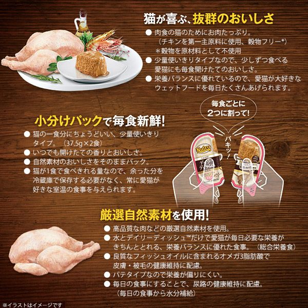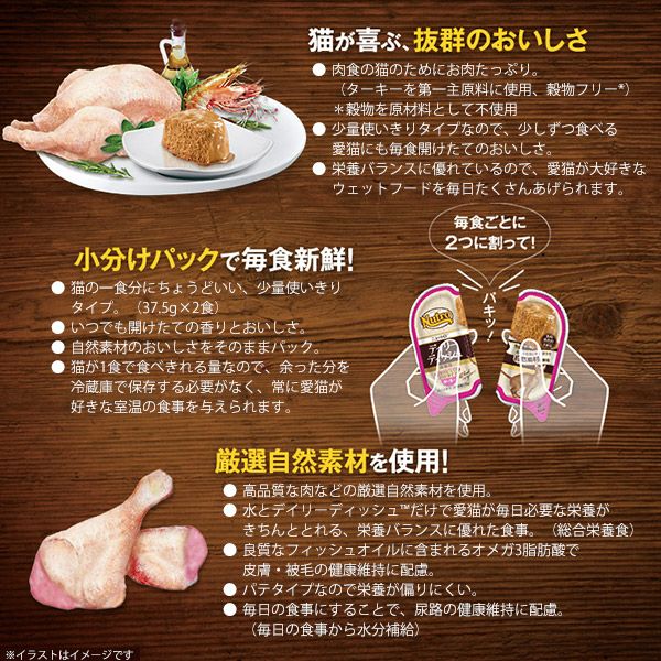 肉食の猫が野生の頃から食べている高タンパクで穀物を使用しない食事をもとに、最新の栄養学と技術をもってチキン(肉)などの厳選自然素材を使用して実現。鶏脂や亜麻仁などに含まれる必須脂肪酸であるオメガ3と6の適切なバランスを参考に設計し、皮膚・被毛の健康維持をサポート。