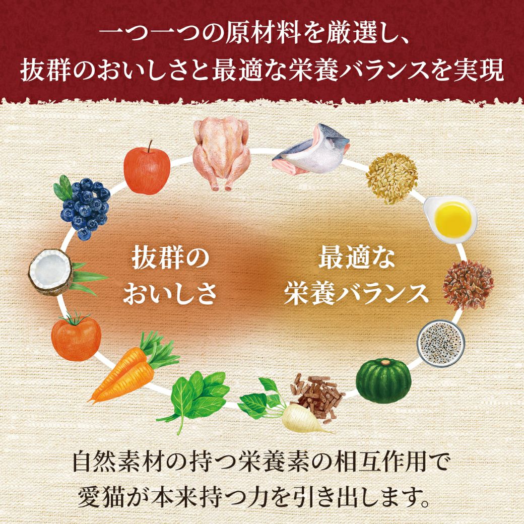 肉食の猫が野生の頃から食べている高タンパクで穀物を使用しない食事をもとに、厳選自然素材で実現