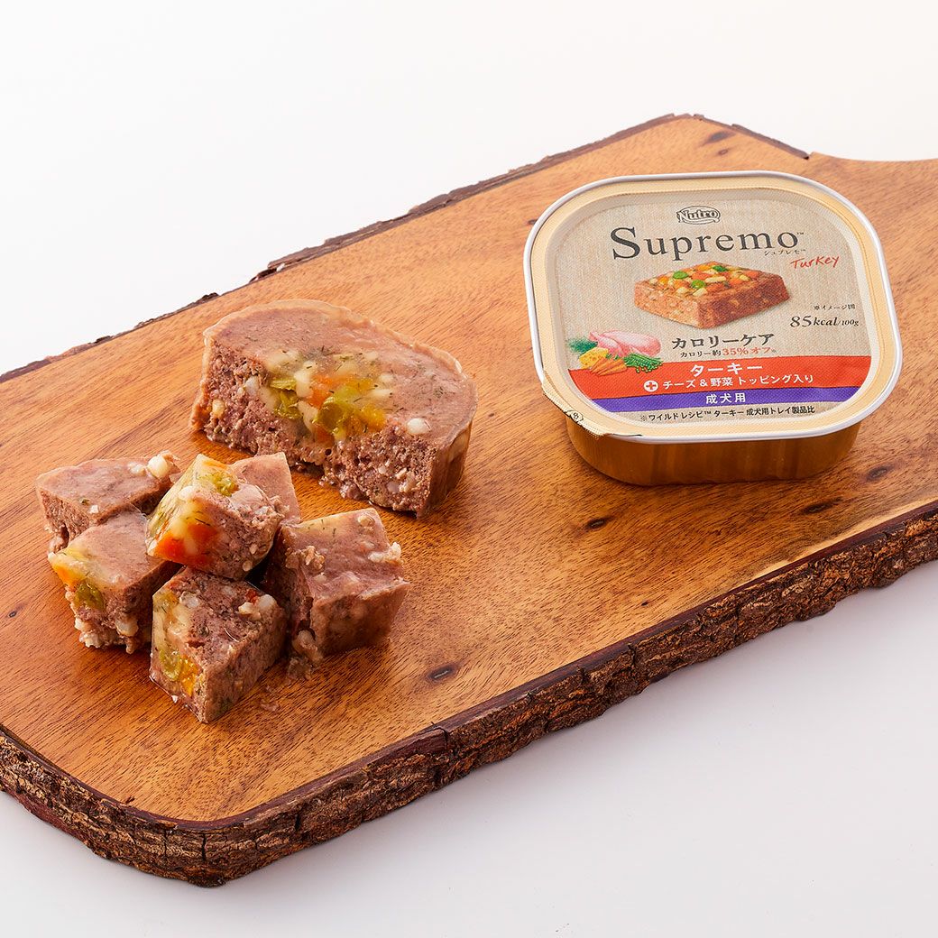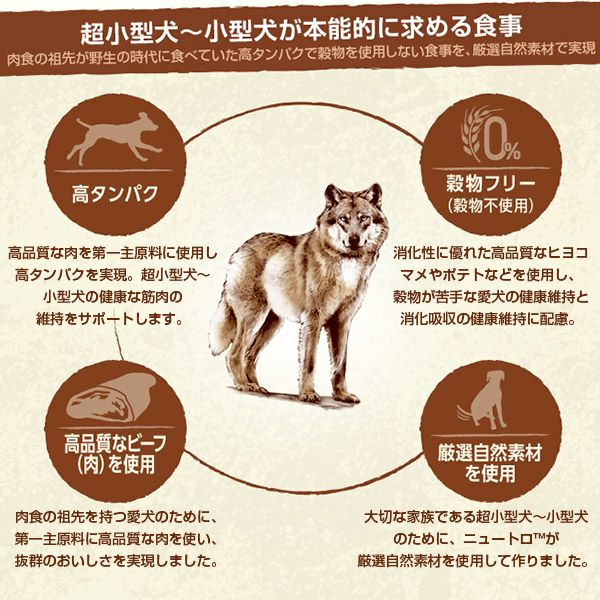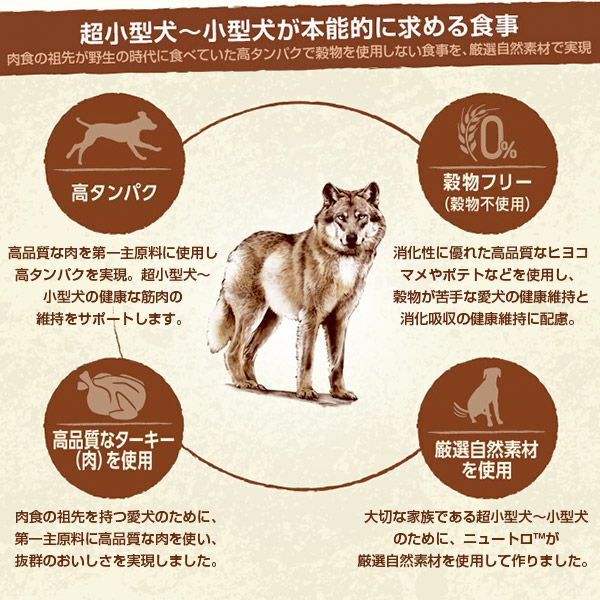 ニュートロ ワイルド レシピは、愛犬の祖先の食事に着目し、愛犬が本能的に求める高タンパクで穀物を使わない食事を、ターキー(肉)をはじめとする高品質な厳選自然素材で作りました。