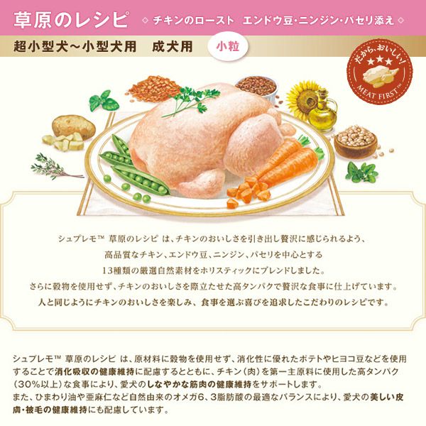 ニュートロ ワイルド レシピは、愛犬の祖先の食事に着目し、愛犬が本能的に求める高タンパクで穀物を使わない食事を、ターキー(肉)をはじめとする高品質な厳選自然素材で作りました。